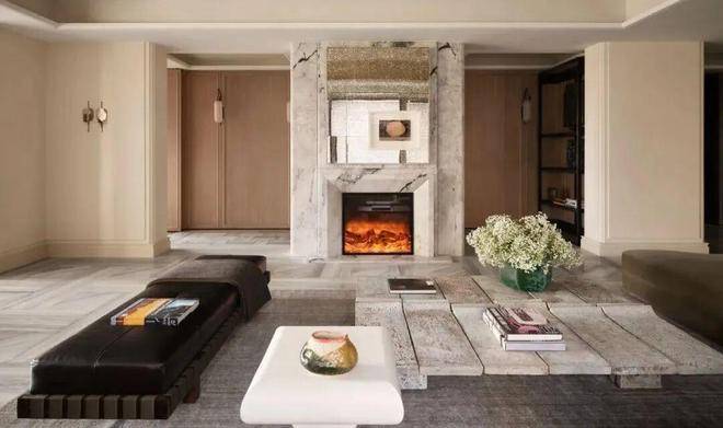的搭配增强入户尊贵感。右侧是山水白奢石的开放格,左侧是行李间,通过暗门的做法,将功能结合进去,强化了归家的仪式感。会客空间约有50平,餐客厅一体化足足有近百平,尺度感超强。