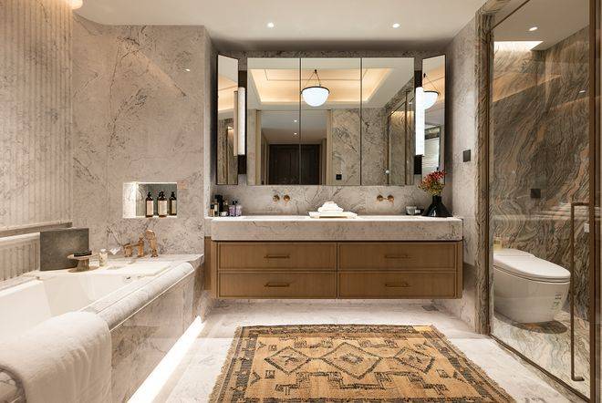 卫生间多处采用弧形处理,并设计了很多人性化细节,例如浴缸装有内嵌式扶手、边角为圆弧处理、台面增加古典腰线处理的挡水条,提升颜值的同时提升使用的便利。